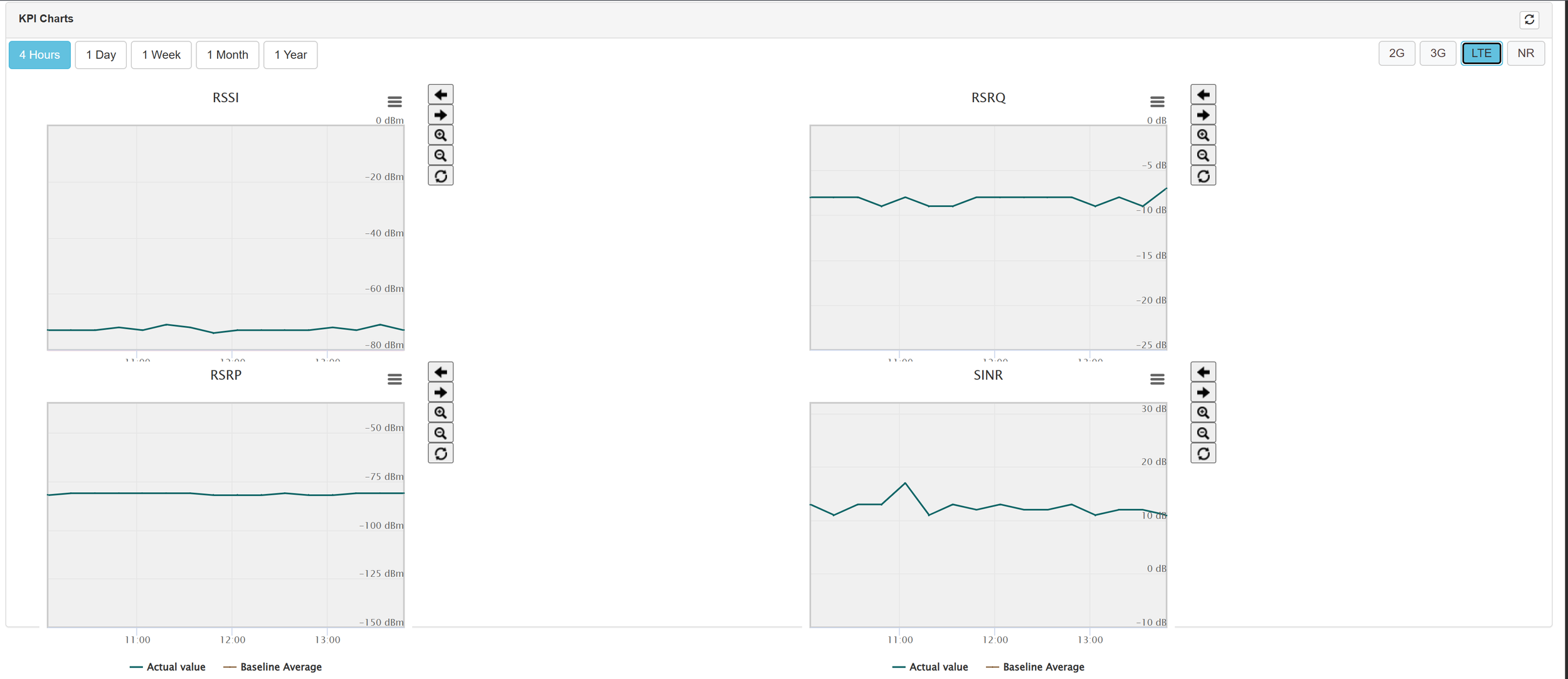 The dashboard for the KPIs offers a table view with the statistics from yesterday and today. Furthermore, it also offers an insight into the value changes over a chosen time period. It is possible to choose the network type for which the values are visualized (2G-5G).