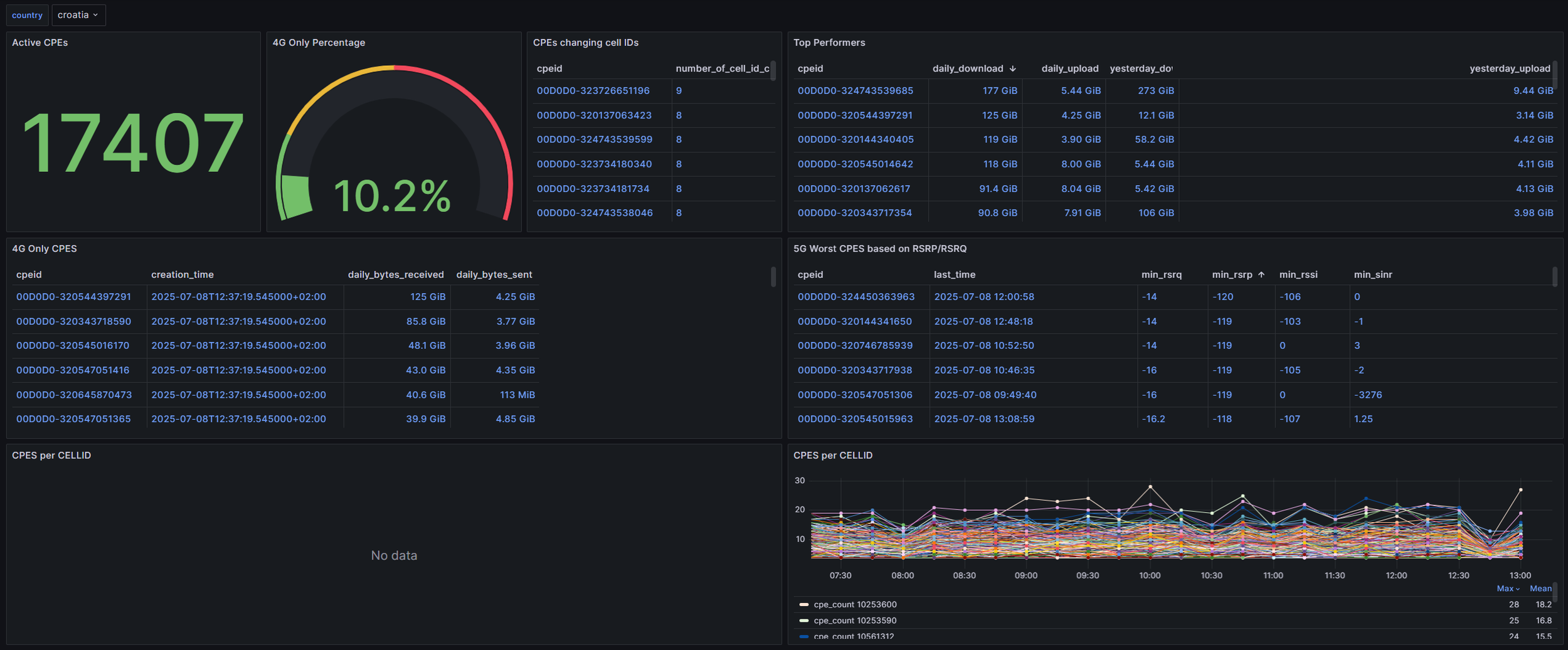 The FWA bundle offers the possibility of additional dashboards which show, for example, a high-level overview of the network. The screenshots below display Grafana dashboards with the overall number of CPEs monitored, and most important information, based on which the overall network state can be determined. This information includes the worst CPEs based on RSRP/RSRQ KPIs, number of CPEs per cell ID, CPEs which change the cells often, and CPEs which do not have 5G capability.