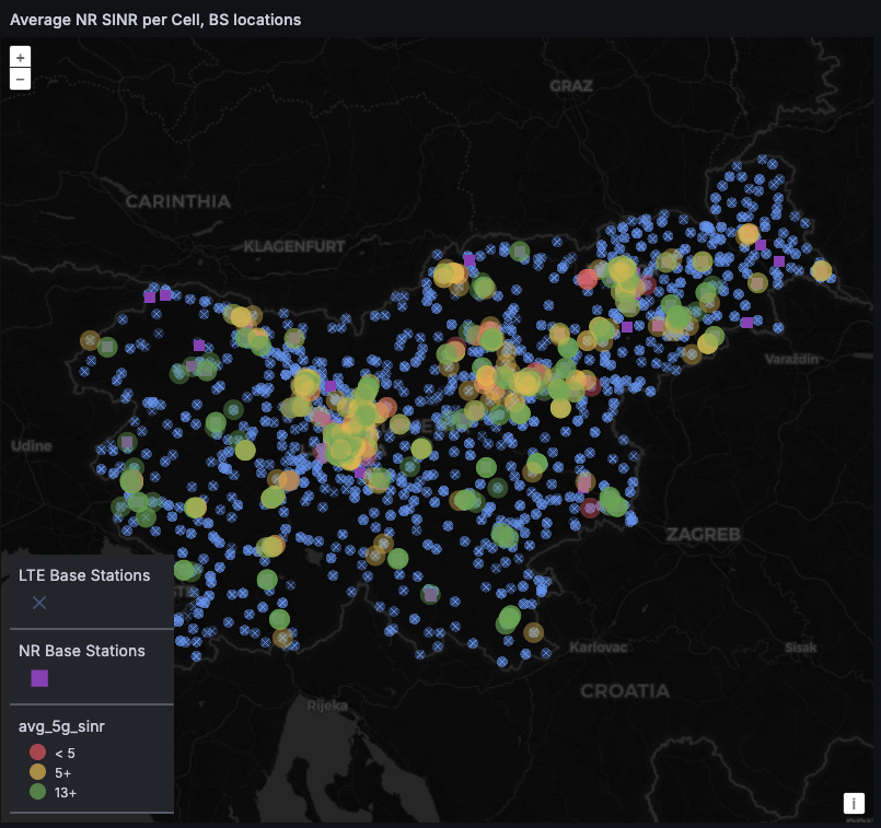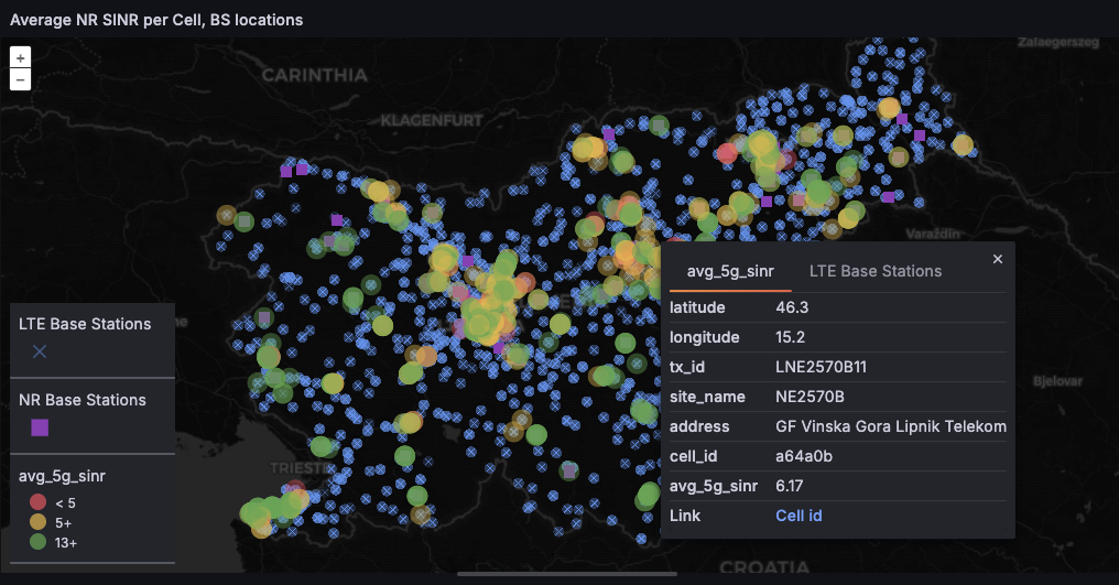 For the ISP it is useful to have an overview of the network performance in different regions. The map view is particularly useful in this regard. The dashboards shown below provide information about the number of CPEs in a cell, and SINR values per cell.