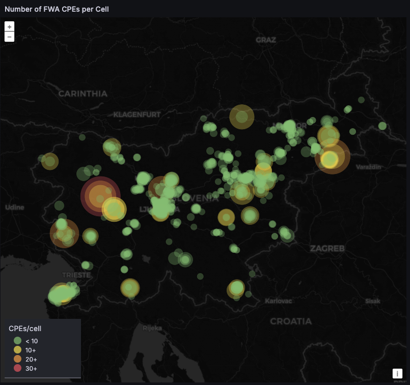 To tackle the challenges of deploying FWA CPEs, Axiros offers a dedicated module, FWA bundle, which monitors the most relevant KPIs for mobile networks, overall traffic and impactful network changes. Additionally, it is possible to create different visualizations which show the geographical locations of the CPEs with the values of most significant KPIs.